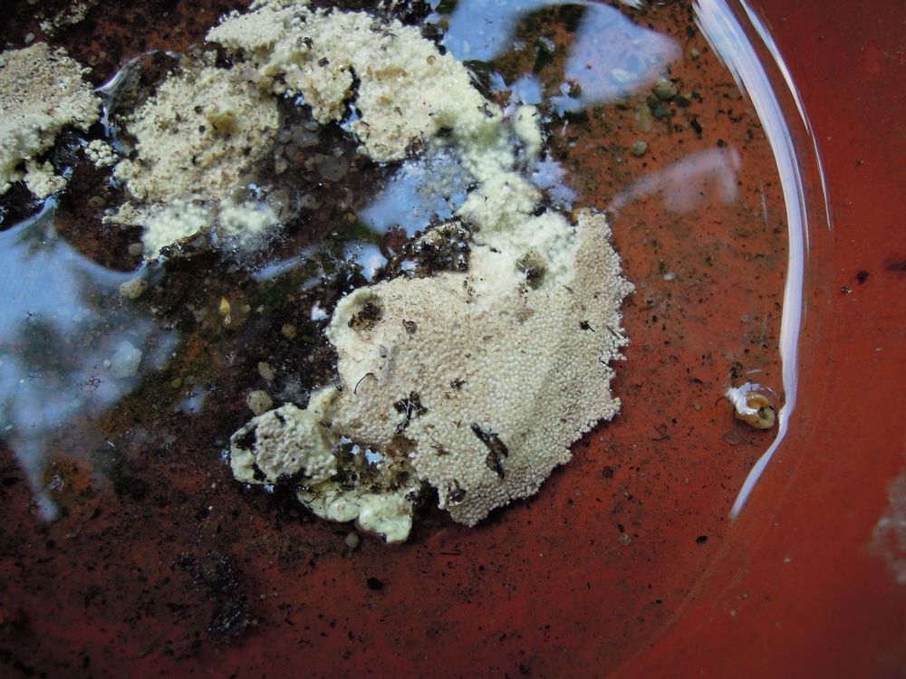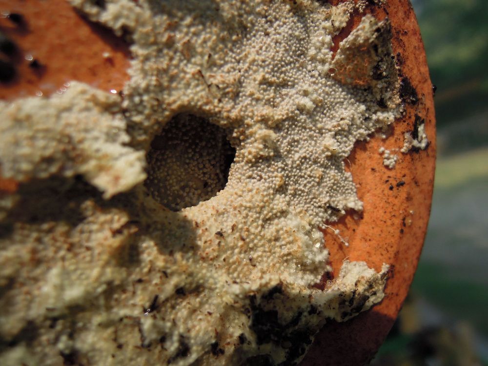 Toto narostlo na dně keramického květníku z vnější strany a v podmisce. V květináči je Dorstenia foetida. Krásně to voní po hřibech. Že by hlenka?