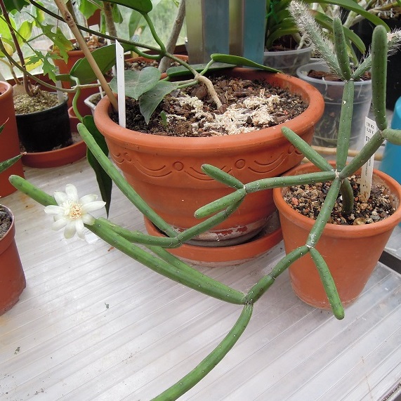 Rhipsalis neves armondii, květ jemně voní, za povšimnutí stojí vpravo nahoře silně ostnité články.