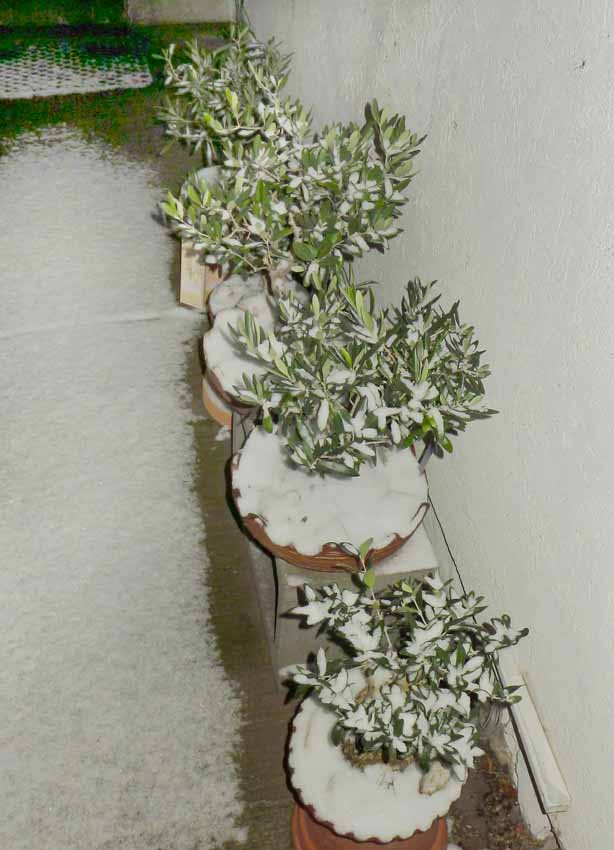 Tak jsem dnes na Libuši navštívil osobně firmu Palmycycasy.cz abych zjistil tu mrazuvzdornost olivovníků přímo u odborníků. Tak prý do -5°C nehrozí vůbec žádné nebezpečí ani u bonsají v miskách. Rostliny ale mají mít substrát spíše sušší, ale ne přeschlý. Asi by to chtělo trochu přístřešek aby se zemina po dešti nemohla rozbahnit a pak v ní rostliny zamrznout. Jinak venkovní prostředí s ochranou proti dešti rostlinám svědčí. Nějakých -7°C krátkodobě by měly snést. Pak již ale záleží na celkové kondici a mnoha dalších činitelích. Já mám rostliny částečně chráněné u domu kam prší jenom od jihu a pouze trochu. Připadá mi na nich, že vypadají lépe než když jsem je měl ve skleníku při teplotě 10-14°C. Tak je zatím nechám i nadále venku. Doufám že bude pravda co říkali a že si nechtěli pouze zajistit odběratele na další rostliny
