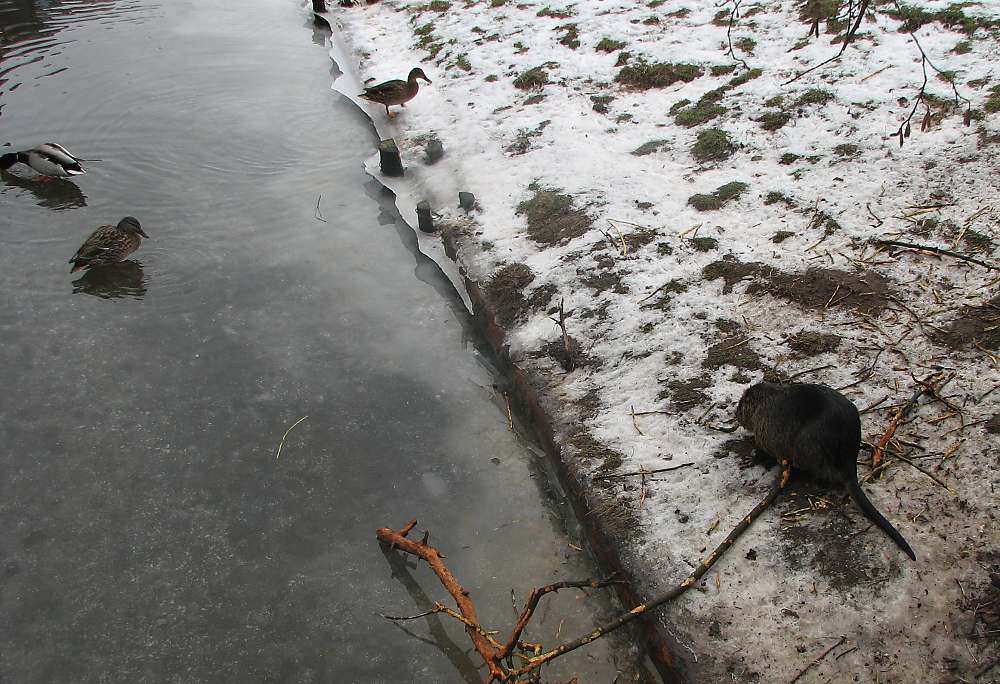 Z dnešní procházky.Mohla bych klidně říci ,že to je z mého pozemku :mrgreen: ale ne je to kousek od hlavní ulice v Kuklenách.Můžete někdo znát.Nutrie jsou tam už roky-asi nikomu nepatří.Jen jsou poslední zimu na trochu jiném místě .Zřejmě blíž k potravě.