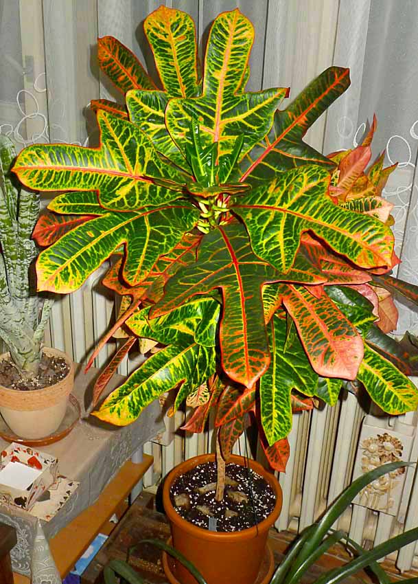 Kroton je krásně vybarvený v každou roční dobu. Tento kultivar s listy až 30cm velkými se šlechtitelům obzvláště povedl. Letos se u mne po letech dočkal přesazení.