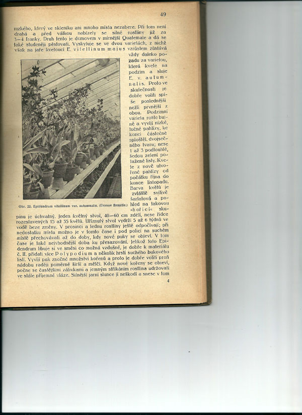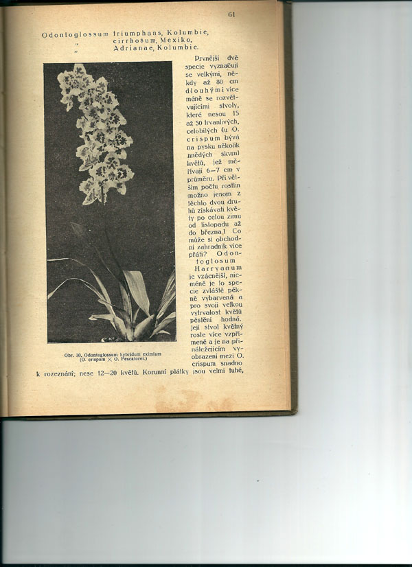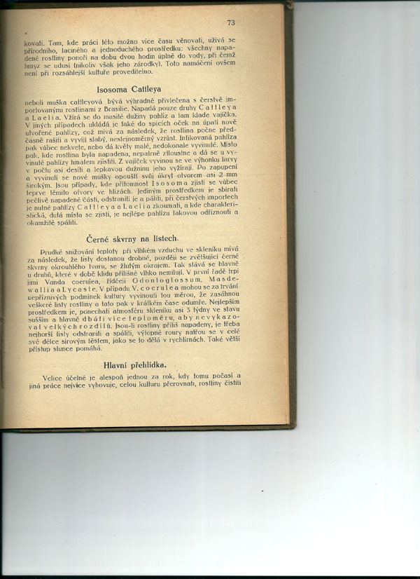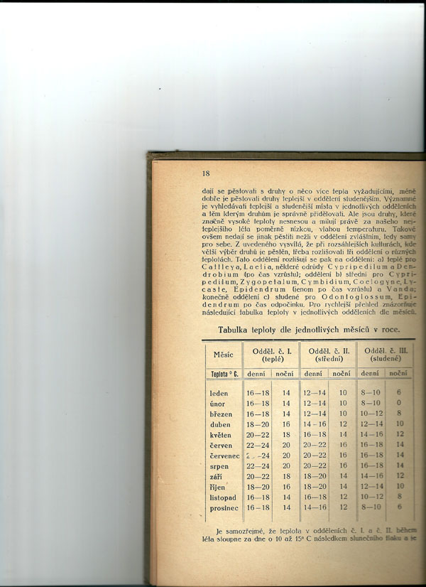 Vážení přátelé. Když tak neustále sleduji dotazy na tomto fóru, tak vidím defakto neustále se opakující dotazy a přitom se stačí jen trochu zamyslet. Tím, co sem nyní píši nechci nikoho urazit ani napadat. Jen chci ukázat, že se zdravým rozumem a trochou pozorování lze vyřešit mnoho věcí. Víte v době pana Varáčka nebyl internet, žádná literatura, pan hrabě dovezl vzácné rostliny, za které dal v té době majlant, vše předal zahradníkovi a řekl starej se. No a nyní se pomalu dostáváme k meritu věci. Co tehdy zahradníci měli. Klasické skleníky, na půl utopené do země, hnojili kravincem a slepičáky, postřiky proti škůdcům byly v plenkách o chemii ani nemluvě. Zkušenosti získávali pomalu a draze ne jako dnes když rostlina zajde tak se koupí jiná. Měli ale jednu obrovskou výhodu. Nevěděli, co je konduktoměr a správná vodivost, nevěděli co jsou měřáky PH ale zato se uměli dívat a hlavně rostlinám naslouchali. Když rostlině nebudete naslouchat, tak Vám i veškeré přístroje a nejnovější chemie k hnojení a ochraně nebude k ničemu. Přesto dokázali rostliny pěstovat tak, že nám lezou oči z důlků a mnozí z nás jsou rádi, když vykvete alespoň jeden kvítek. Přitom už tehdy uměli dovést do květu Dendrobia, Epidendra, Cattleya, Odontoglossa, že jim můžeme závidět. Už tehdy dokázali že rostlina Odontoglossa měla sotva tři pahlízky a kvetla jak blázen. Pořád se tady bavíme o různých skvrnách na listech a stále ve všem vidíme největšího strašáka a to virozu. Co když to je tak, jak to popisují oni? Když jsem začínal, tak jsem pěstování v mnoha případech podřídil jejich postupům a myslím, že výsledky mám velmi obstojné. Zkuste se nad tím zamyslet i Vy a ne jen slepě hledat a zkoušet stále nové a nové způsoby pěstování, které tím střídáním ani vlastně řádně neodzkoušíte. Možná, že Vám to pomůže k daleko lepším výsledkům. Přikládám i pár stránek z Varáčkovi knihy Orchideje abyste věděli, že i při tak zoufalých podmínkách, které měli dokázali to, co i dnes stojí za obdiv. Je tam i teplotní tabulka, jak rostliny pěstovali podle teplotního zařazení i rada co se skvrnami na listech. Možná Vám to pomůže.
