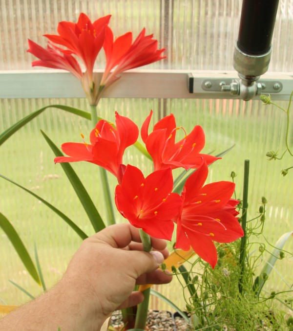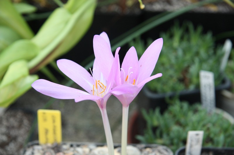 Dnes jsem opět něco nafotil, tak si přihřeju polívčičku  . Bílá forma Cyclamen hederifolium. Cyclamen graecum roste na menším areálu než ten předchozí, pro úspěšnou kultivaci potřebuji zvláštní souběh protichůdného - v létě se musí hlíza nechat úplně vypéct v suchu, ale zároveň by neměly odejít kořeny. Řeší se to buď sázením do vysokých květináčů, které se v létě občas nechají odspodu nacucat, nebo pěstováním v normálním hrnku postaveném na stále vlhkém pískovém loži. Mám jedinou dospělou rostlinu (no, letos kvete poprvé, dvěma květy) plus hrnek semenáčů - všechny předchozí, které jsem získal, se ukázaly být obyčejným C. hederifolium. Jihoevropský ocún Colchicum pannonicum. A teď do jižní Afriky! Cyrtanthus elatus se dřív pěstoval pod označením Vallota purpurea; před šedesáti lety běžná kytka je dnes obtížně sehnatelná. Padl jsem na ni náhodou v hobby marketu v tom pytlíku s obrázkem, na který tady upozornil orchidejky (pěkný stroj  ), ale jako mnoho podobného materiálu z té západoevropské země s cibulovým průmyslem je zavirovaná. Snažím se získat z ní semena a přesít ji, jednou udělala semeník, ale nic nevyklíčilo. Tak snad letos. Omlouvám se za tu pazouru, ale oba stvoly jsou otočené od uličky a květináč je přirostlý k pískovému loži a nechce se mi ničit kořeny. T.