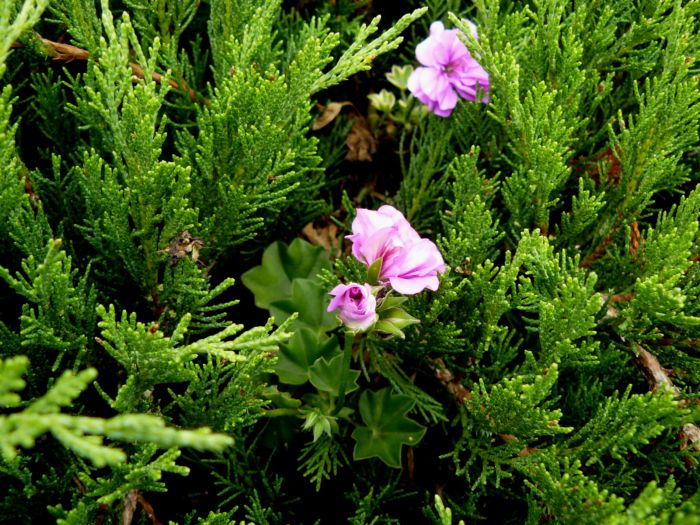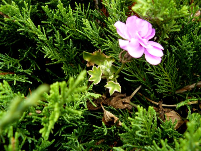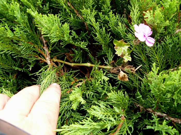 Při vichřici před dvěma týdny se polámaly převislé muškáty. Žena odnášely polámané věci do popelnice a jeden z ulomených kousků bez kořenů spadl do thuje u skalky. Je to dva týdny, u nás za tu dobu sprchlo dvakrát ale jinak vedra na padnutí. Je zajímavé, co ten muškát dělá. Rozvíjí listy i květy bez kořenů i zálivky a to v suchu a vedru. Nechápu, že ho sluníčko už nezpražilo. Ta thuja je na jižní straně v plné palbě slunce od rána do večera.