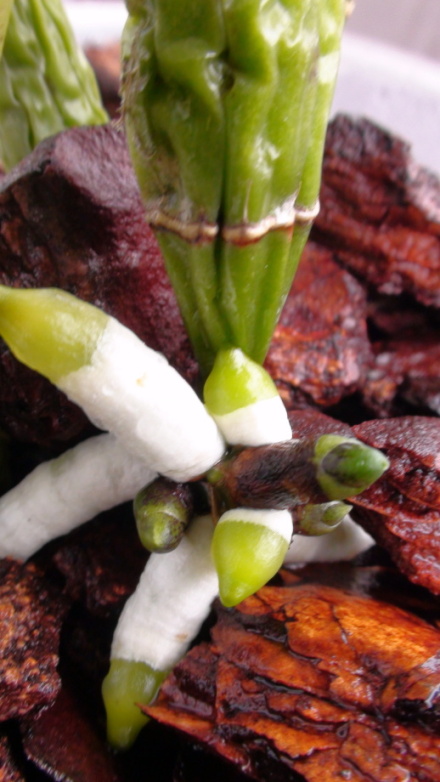 Letos na jaře jsem na výstavě ve Vídni koupil oddělek C.walkeriany,var......Je to takový chudáček,co bych taky za 25 E chtěl.Až asi před měsícem se začal oživovat !Teď jsem pod lupou zjistil,co se to vůbec děje.Vypadá to jako meristem(nikdy jsem naživo neviděl),jedno očko se roztrojilo ,to je málokdy vidět u dospělé rostliny.Jsem zvědav,zda všechny výhonky budou normálně přirůstat.Orchideje pěstuji z více či menšími úspěchy přes 40 let ,toto jsem ale neviděl!