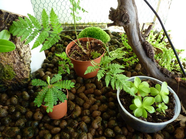HAKI píše: Ta rostlinka v menším květníku (nemám název) není kapradina  ale má signalizovat vysychání substrátu?Ve skleníku prý roste zdařile-jak plevel. K té vitríně -mě by se spíš Věrko líbilo rostliny zasadit do nějaké myšlenky-nápadu (ale třeba to takto chceš) přímo do substrátu , na kůru atd. jako napadobení přírody.V tvém případě něco méně vzrostlého . Tak pošlu svoje políčko -ještě to není ono ,ale začátek to nějaký je.Budu ještě přikupovat. Hanko, dole je keramzit,ten je vlhký.Jinak ta rostlina je Mimosa, kvete žlutě. Musela jsem vitrínu přestěhovat(dočasně)předěláváme půl baráku,tak potom něco vymyslím a budu ráda za každou radu,,pá Věra
