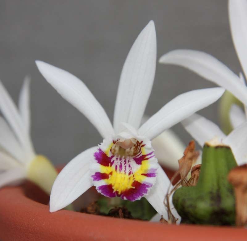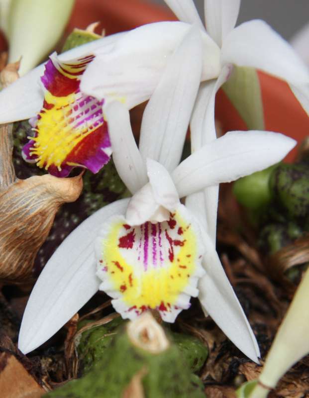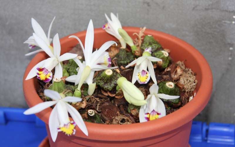 Tak ten květináček... Myslel jsem ale, že tam bude větší variabilita v květech, protože jsou to rostliny zjevně sbírané v přírodě (pahlízy byly dost "obroušené") - zatím jsou tam patrné asi tři klony, z toho dva jsou si hodně podobné :( . Vkládám naděje do těch dvou nebo tří, které se ještě neotevřely, ale podle barvy poupat už je skoro jisté, že petala i sepala budou opět čistě bílá (toužil jsem po lehce růžových, případně s fialovými proužky, jak je to vidět na fotkách jiných pěstitelů) a případné odchylky budou zase jen na pysku. Ale stejně jsem spokojenej :D .