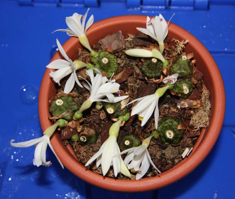 Nemyslím, že by rašila nějak extrémně brzo. Jak jsem říkal, rozsekal jsem ten květináč na jednotlivé pahlízy a byl jsem hodně překvapen, jak měly vyvinuté nové kořeny - některé byly dlouhé přes pět centimetrů. Čím déle tuhle kytku mám, tím víc jsem přesvědčen, že alespoň některé formy nevyžadují striktní období klidu jako ostatní pleionky (byť při trochu vyšších teplotách než u těch ostatních). Pokud má trochu vyšší teplotu, začne pomalounku rašit už na podzim; asi se to s tou teplotou nesmí přehnat, protože při vysoké teplotě a intenzivnějším růstu v tomto období by hrozil nedostatek světla a vysílení pahlízy. T.