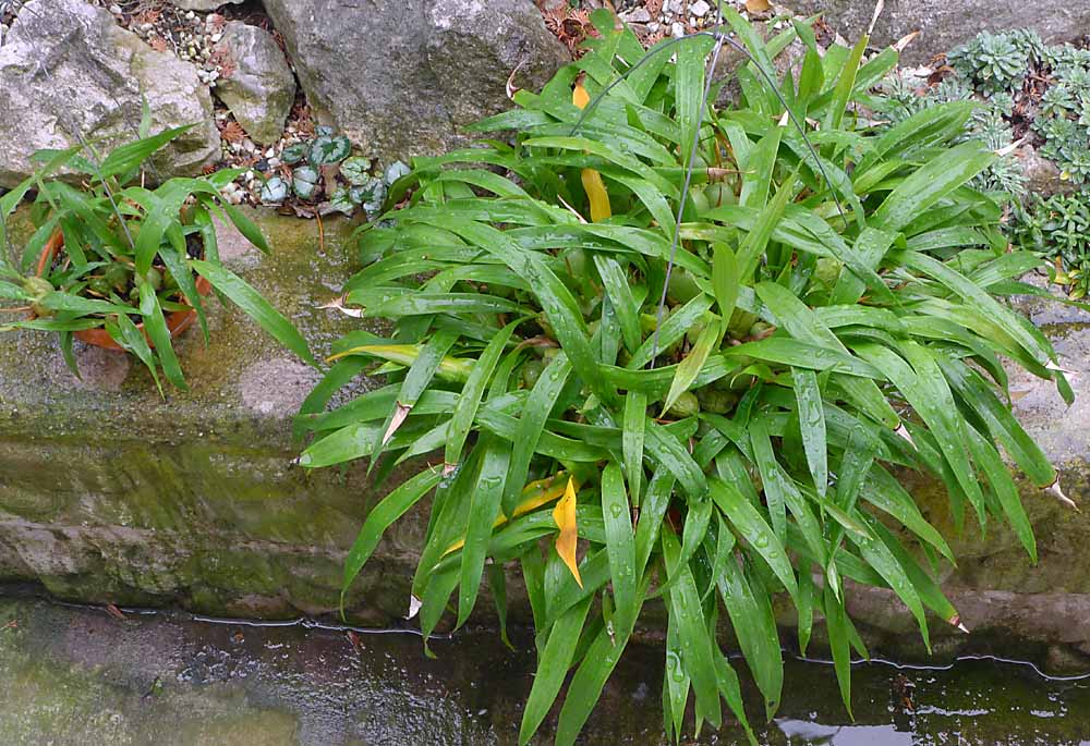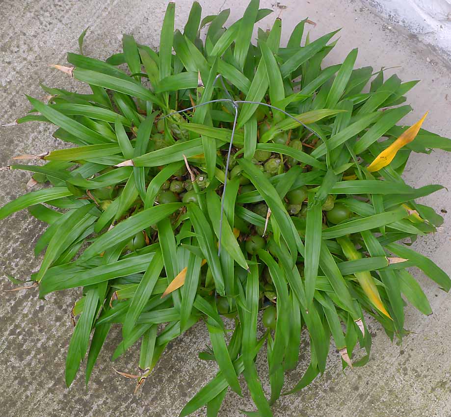 Někde jsem četl, že v domonině roste na zídkách a skalkách v mechu a tak jsem usoudil, že vrstva substrátu nemá být moc silná. Hluboký květník 50cm v průměru by celý neproschnul nikdy  . Nádoba se mi sháněla špatně. Nakonec jsem objevil v zahradním centru zelený plastový kulatý rám asi 50cm v průměru a asi 10cm hluboký. Dno bylo plastové síto s asi 0.5cm oky. Bylo to určené na prosévání zeminy. Zasadil jsem ji do toho a zhotovil závěs. Voda dobře odtéká, vysýchá to i odspodu a kytce se v tom líbí. Najít ale na trhu něco podobných parametrů není vůbec jednoduché. Miska navíc musí být dostatečně pevná, protože váha rostliny je již dosti značná.