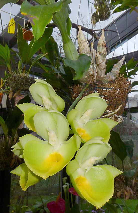 Takhle nyní rozkvetlo Catasetum pileatum "Oro Verde". Pět květů ho hodně převažuje s celým košem. Z druhé strany pahlízy začal navíc rašit další květní stvol.