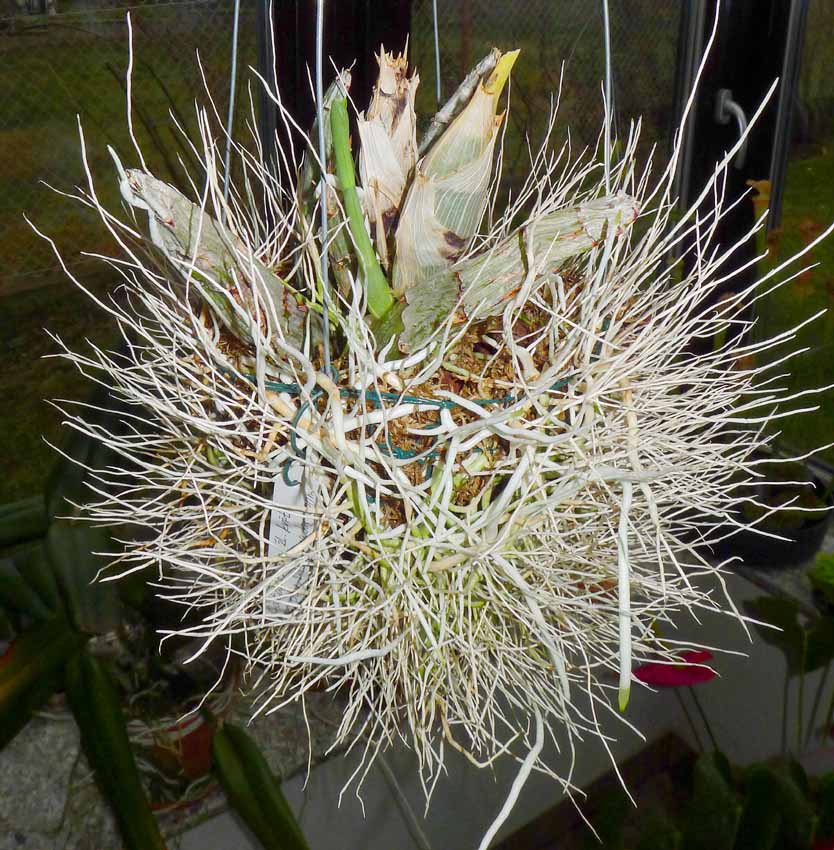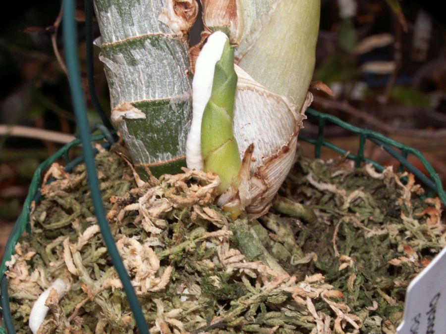 Cycnodes se dal do nezadržitelného růstu, stará pahlíza je plně olistěná, ale vevnitř se to nějak scvrklo. Tak jsem to namočil, ale jen do poloviny. Za tím novým výhonem je kořen co rostl na květním stvolu.