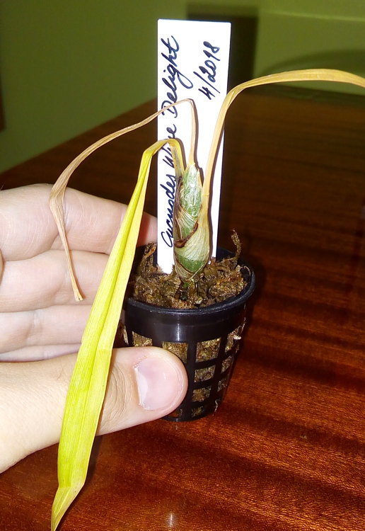 Přikládám slíbené foto nového výhonu. Kytka v podstatě nepřestala růst, při pokusu o zasušení se začaly scvrkávat pahlízy jako by byly ještě nevyzrále, taj jsem to zalil a ony se napily, pak to vypustilo nový výkon a to už se nedalo nezalévat, když všechny kořeny byly funkční a přidaly se ty z nového výhonu. Jaký vliv to bude mít na kvetení se teprve uvidí.