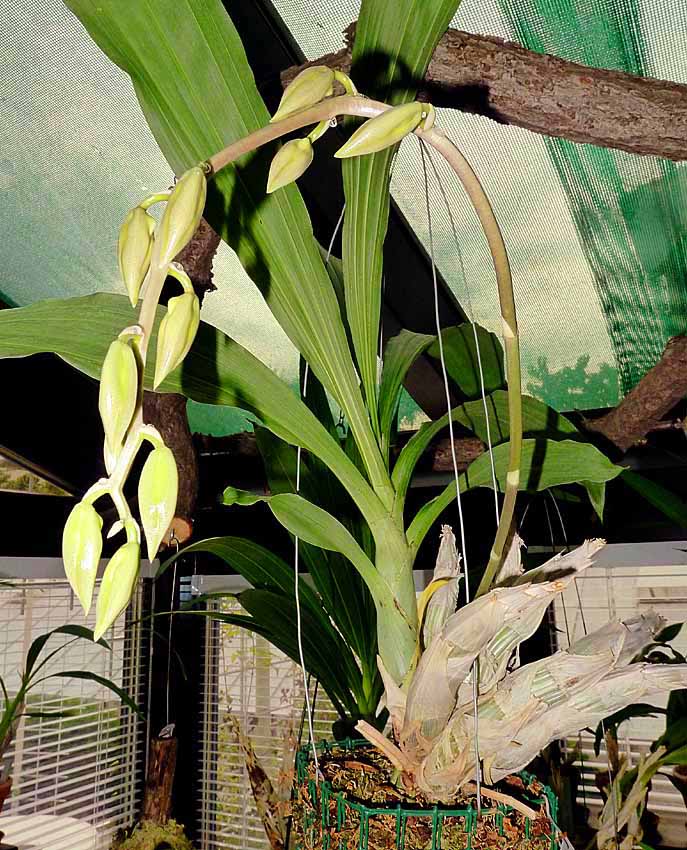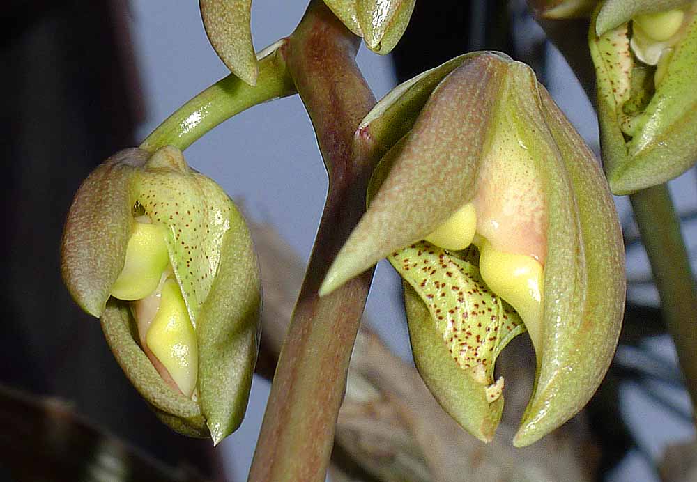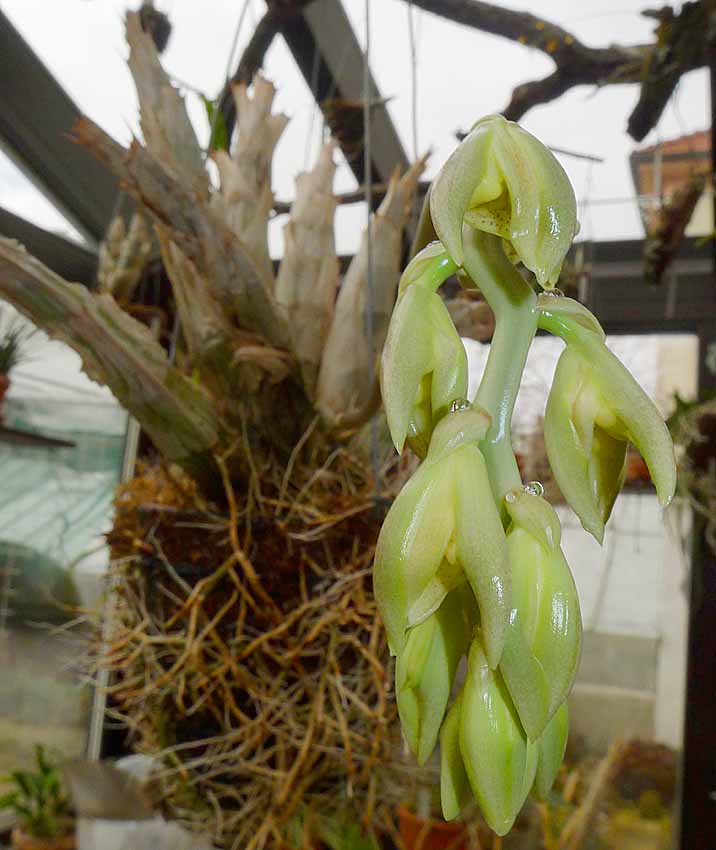 Tak se mi začalo klubat nějaké jiné květenství na C. laminatum. Jsem zvědavý co z toho nakonec bude. Myslím, že to bude zase samčí ale nějaké divné. Jednou se mi to stalo v létě a domníval jsem se, že to bylo vlivem vysokých teplot a slunce. Nyní to je ale na zimním kvetení. Vypadá to hodně divně. Přikládám snímky normálních poupat a dole jsou ta nynější.