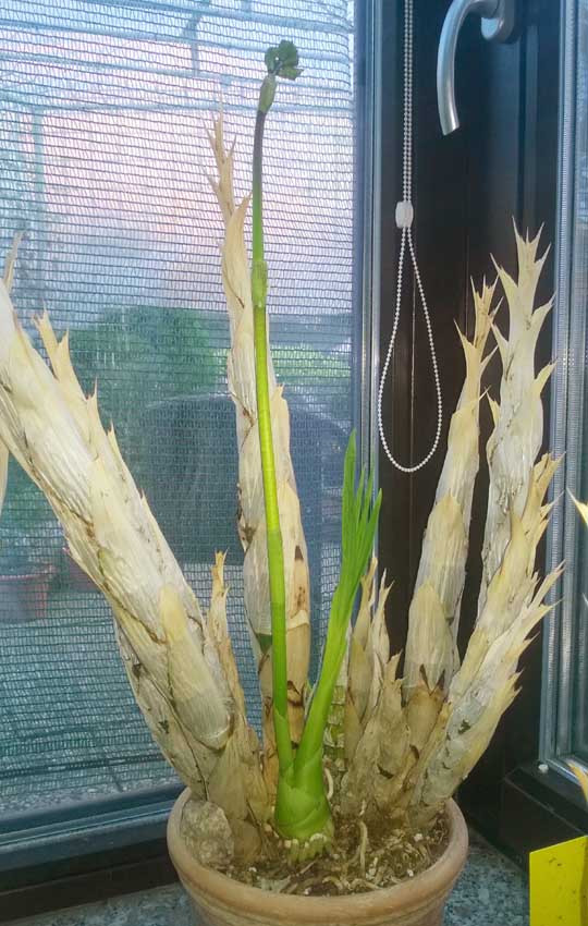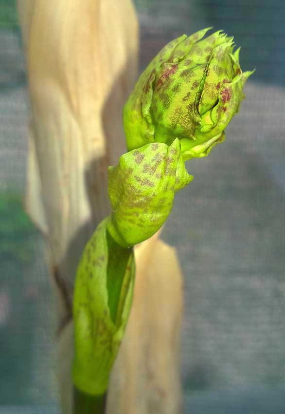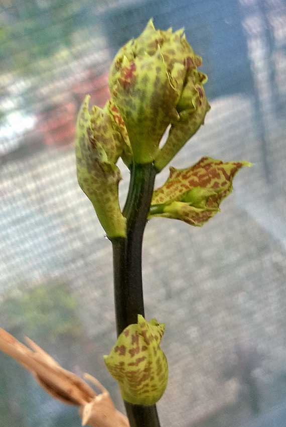 Do květu to ještě nějaký čas potrvá  Punktatovat už začíná na lístcích toho stvolu- tak snad to bude to punctatum a budou kropenaté i ty květy  V překladači vypadlo něco jako kropenatý, tečkovaný ap. Ty kořeny se derou také jak o závod.