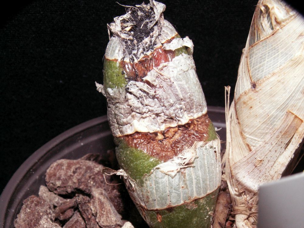 Tak abych to své poškození dovysvětlil, pahlíza před částečnou amputací vypadala takto, viz obrázek. Zdálo se mi, že se to nerozvíjí, taky jsem to postříkal tím clavicidem. Pak se mi tedy zdálo, že pahlíza žloutne i z druhé strany. Neřezal jsem to, ale ustřihl, proto ten ježatý řez. A odstřihnutý konec jsem ještě rozstřihl, aby bylo vidět, kam to až zasahuje. Takže tolik, ránu jsem zasypal dřevěným uhlím.