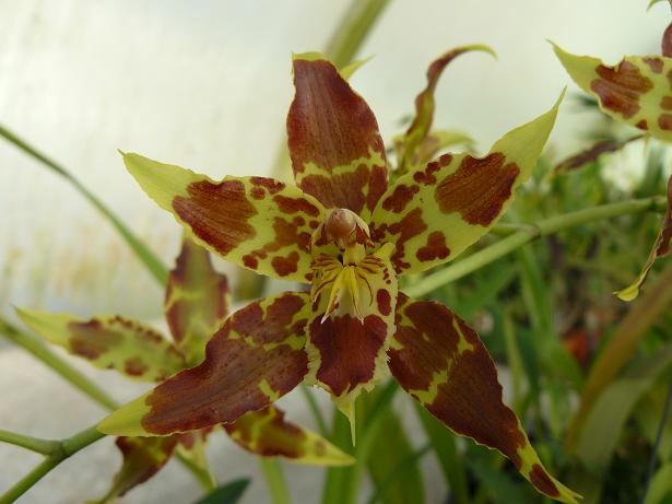 Také mi vykvetlo Odontoglossum cristatellum, ale tak pěkné jako Věry není.  Na stvolu je osm květů velkých 6 x 6 cm.