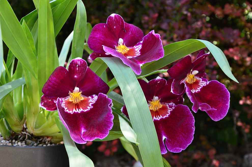 Rastlinku mám tri roky, kupovala som ju vo výpredaji a už minulý rok mi krásne kvitla. Teraz kvitnú štyri kvety a ďalšie štyri sú pripravené. Dúfam, že stihnú tieto súčasné... Krásne vonia.Rastlinu pestujem v čistom anorganickom substráte v samozavlažovacom črepníku. Listy absolútne neharmonikujú, preto som presvedčená, že tento spôsob pestovania Miltoniopsisom vyhovuje.Majú zabezpečenú stálu vlhkosť sbstrátu a to potrebujú. Nie je to návod na pestovanie, len postreh z mojej strany ako to u mňa funguje. Neletním, pestujem celoročne na východnom okne v chladnejšej predsieni domu.