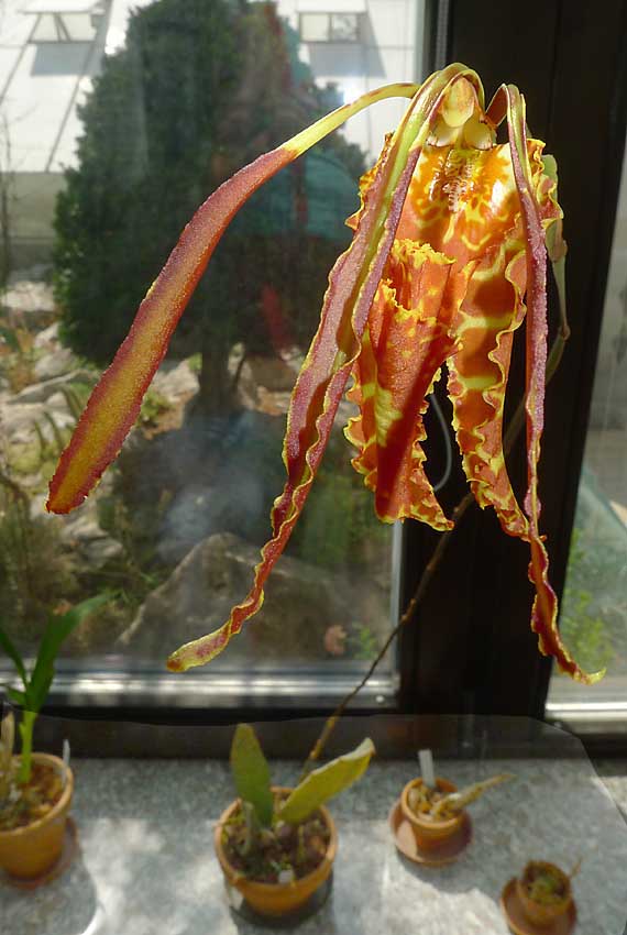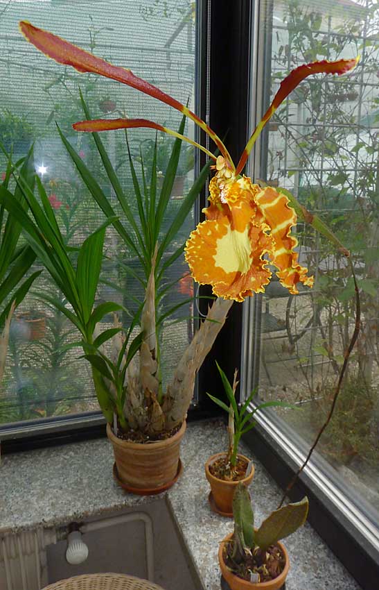 Tak jsem se konečně dočkal květu Psychopsis papilio. Květní stvol se vyvíjel od Drážďan až do teď. Je to ale nádherný druh s exotickým květem. Myslím, že za těch 35euro stojí. Doufám, že bude u mne i nadále prosperovat. Květ mne překvapil svou velikostí. Myslel jsem podle velikosti poupěte, že bude menší. Teď jsem zvědavý, jestli vydrží měsíc, jak jsem někde četl.