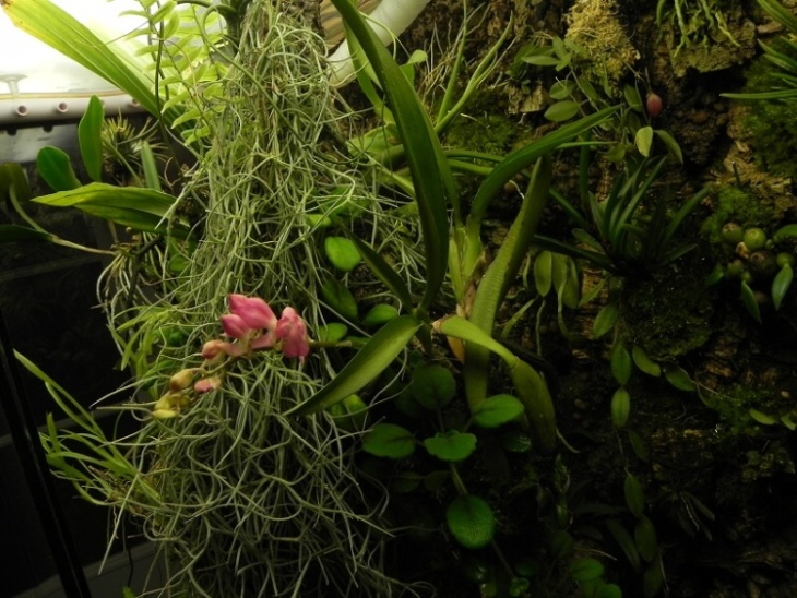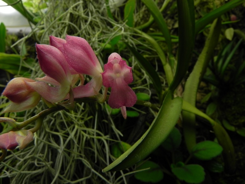 Začíná rozkvétat Rodriguezia lanceolata umístěná od dubna ve vitríně. Mám ji přes pana Kačerovského z Pokojovek objednanou z Ecuagenery. Myslím si, že byla odebrána z přírody nebo byla čerstvě oddělena, protože neměla prakticky žádné kořeny, teď už je má , boční výhon sežral slimák  (zaplatil životem  ) z báze další pahlízy roste další nový výhon, uvidím jak se jí bude dařit dál. Teplota teď od 24°C do 30°C a stálá vlhkost 75 - 85 % .