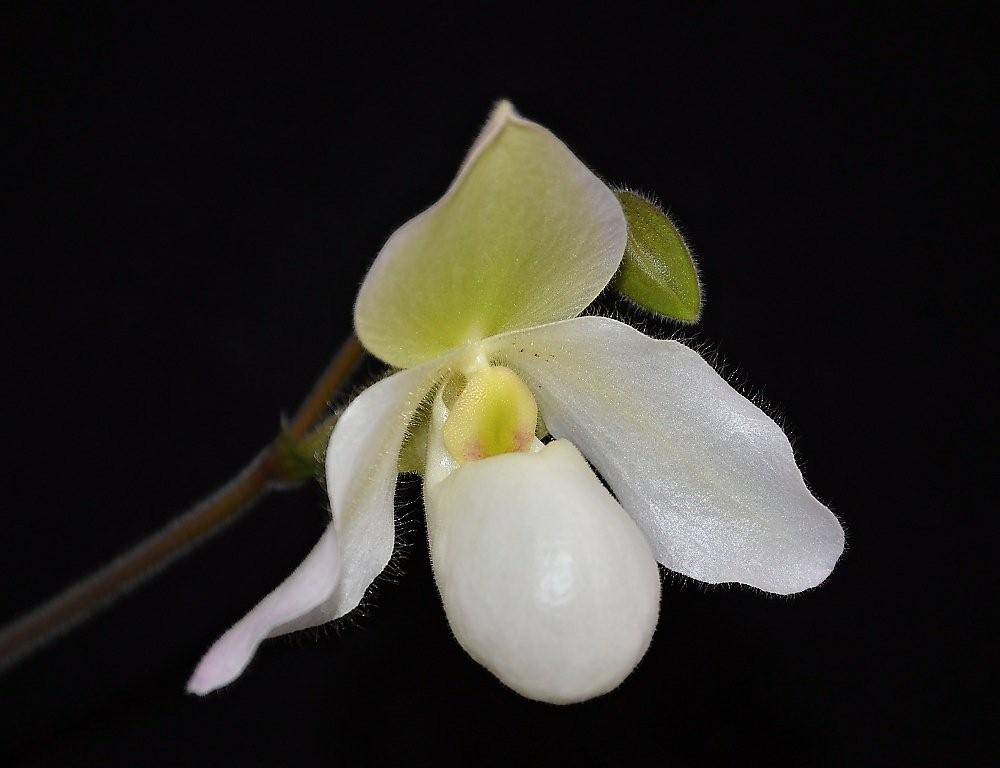 Silvia píše: Rozkvitla jedna snehulienka, je to veľmi spoľahlivý a pravidelne kvitnúci hybrid. Bude kvitnúť aj z druhej ružice, ale pravdepodobne táto už bude odkvitnutá, škoda. Nejspíš to bude Paph. Deperle (delenatii x primulinum).