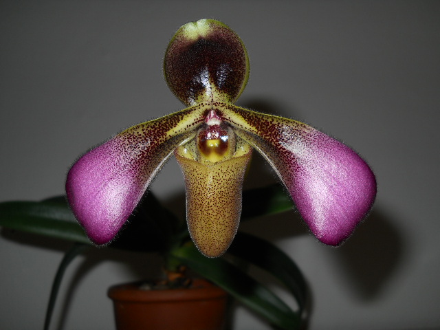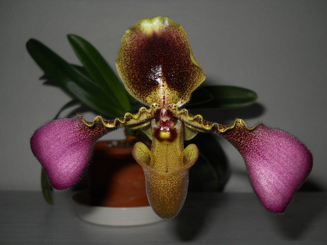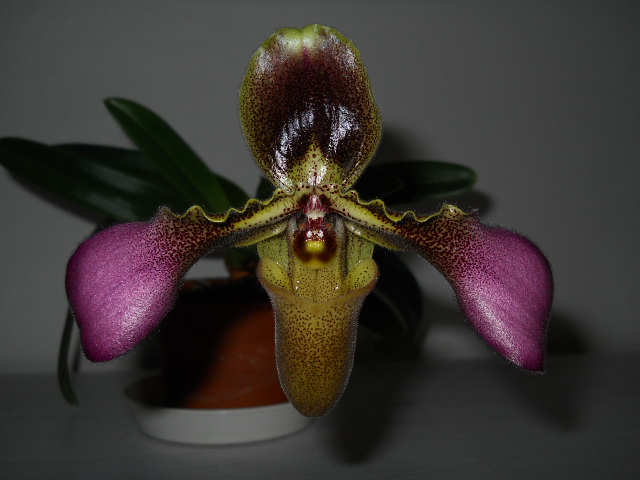 Paphio píše: To je hřích mého mládí. Matka moje (nahoře), otec od Virense Tenhle hřích se docela vyvedl. Rostlina není velká, ale květ má na šířku asi 12 cm, což mi přijde dobrý