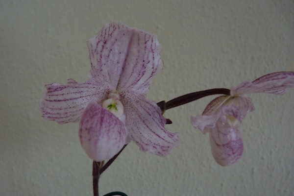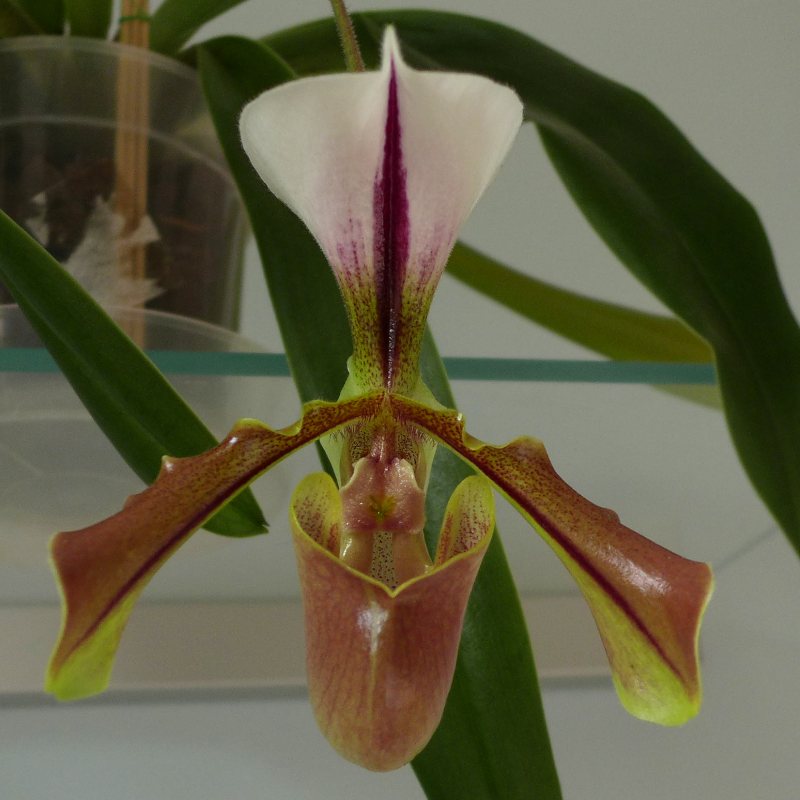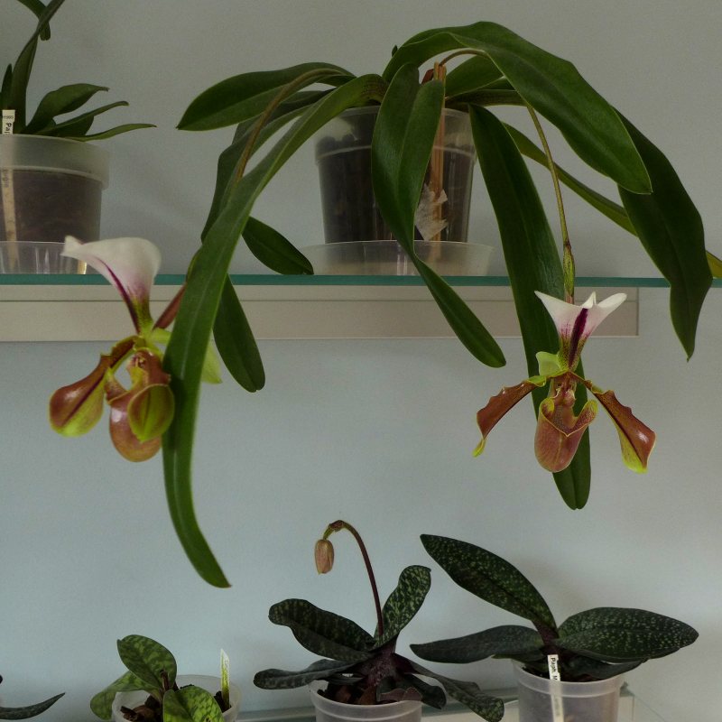 Paphiopedilum lathamianum-já mám asi čtyři rostliny,zajímavé že nejsou stejné,jsou to dva klony(?).Momentálně kvete jeden,druhý odkvetl,má ale ještě poupě,až pokvetou oba vyfotím pro porovnání.