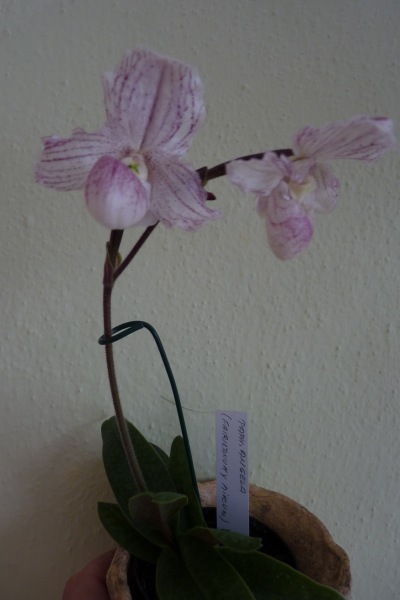 Děkuji všem za příspěvky. Ještě mi kvete jeden, mám ho už 20 let a dlouho byl můj jediný. Kvete sporadicky, jak se mu chce. Přemluvit se dal chladem a tmavším koutem v zimě. Vypadá trochu jako insigne, ale nevím...