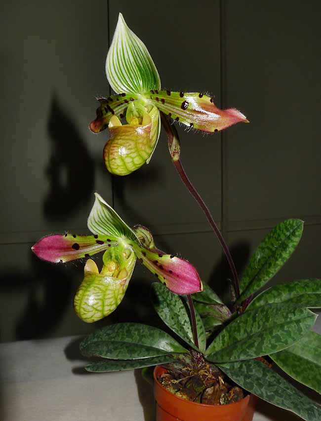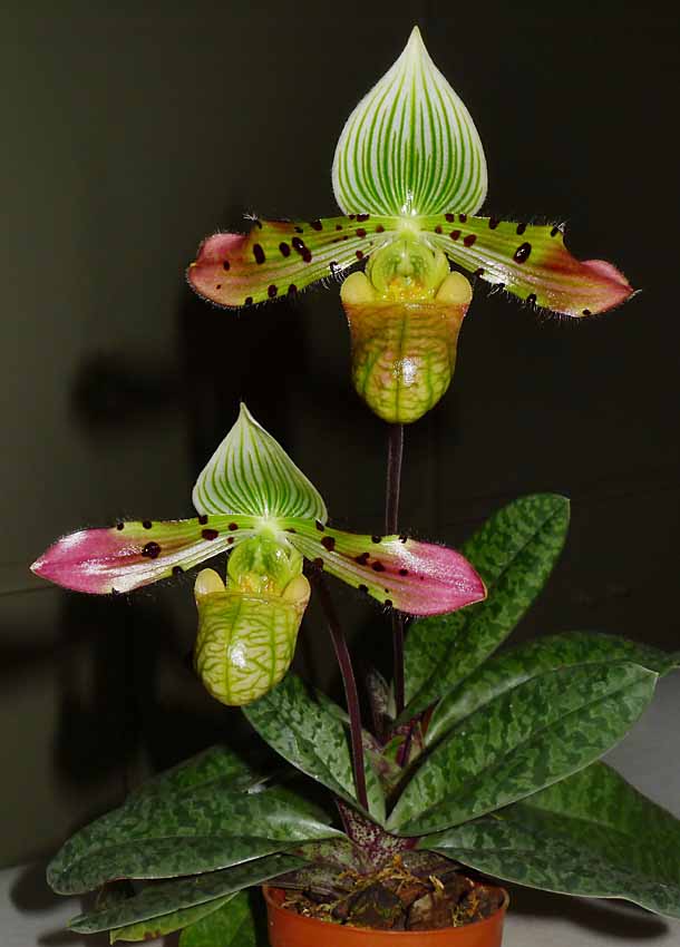 Tak mi vykvetlo 2x Paphiopedilum venustum. Obě rostliny jsem koupil na jaře od p. Zimy. Jedna kvetla hned na jaře a druhá byla po koupi bez kořenů. Obě jak jinak než zasazené v rašeliníku  Ta co kvetla na jaře udělala novou růžici a z ní kvete. Ta co neměla kořeny tak zakořenila a rozhodla se odměnit mne také květem. Jedna otevřela květ asi o 14dní dříve než ta druhá. Na snímku je vidět odlišná barva květů. Dříve jsem si myslel, že jsou to různé formy, ale jak jsem při jarním kvetení zjistil, tak nově otevřený květ má okrajové plátky takové vínové barvy a postupně jak kvete tak se vínová přeměňuje v jakousi žlutohnědou a květ se postupně dostává do té mé "vysněné barvy". Na snímku je vidět odlišnost částečně. Ještě je jednou nafotím asi po měsíci kvetení aby bylo vidět, jak se barevně květy mění. Kresba listů se nakonec ve shodných podmínkách srovnala takže ta bez kořenů co měla kresbu extrémně krásnou má nakonec kresbu stejnou jako ta kvetoucí na jaře, která tehdy neměla kresbu nic moc. Zřejmě ten rozdíl byl způsobený pouze intenzitou světla či jinými podmínkami při předchozím pěstování. Tenhle druh je u mne pafíčko s velkým P. Nádherně kvete, má krásné žíhané listy a snadno se pěstuje a přivádí do květu. Takových druhů v tomto rodě moc není