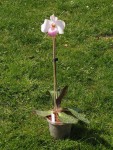 Nakvétá mně delenati,koupené s poupětem loni ve Vídni na výstavě (fotky tu už byly). Snad se ho podařilo protáhnout přes klidovou pauzu v pořádku (studený parapet). Květ bude asi jen jeden-alespoň na této růžici...