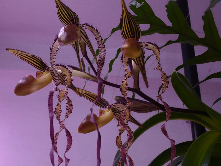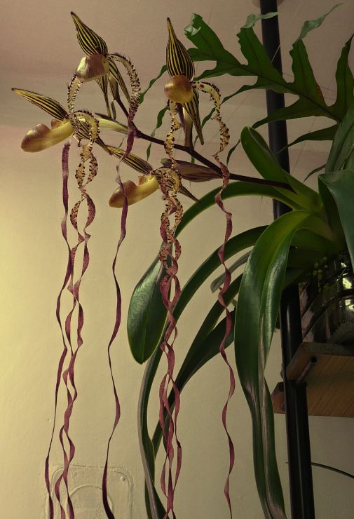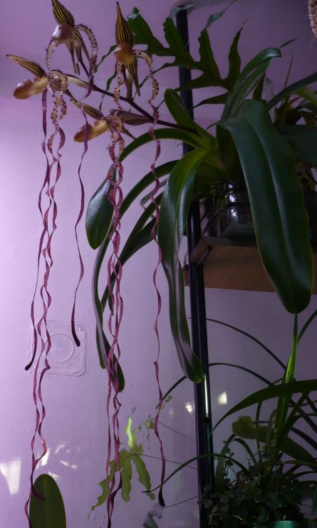Rozkvétají mi dvě rostliny P. sanderianum. Na internetu jsem s pomocí Google našel zajímavý návod:Vlhkost: Vlhkost vzduchu v přírodě je velmi vysoká, takže se snažte udržet 60% jako minimální a 70% nebo vyšší, jako ideální. Dobrý pohyb vzduchu je zásadní. Mnoho pěstitelů umístí zařízení (v květináčích) do koše, aby je oběsili. Oběšenou orchidej jsem ještě neviděl- jak se to dělá?