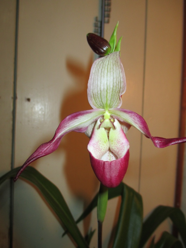 Ono tak snadno neshnije. Naopak má být jako všechna phragmipedia stále ve vlhku. Nejlépe dát květináč do obalu a stále asi 1cm vody. Hnojím stejně jako všechny orch. jednou za 14 dní, a protože rostě stále i přes zimu i když méně, tak hnojím celoročně. Je na jižním okně, teploty temperované, je v zadní řadě. To moje není tak červené. Je to kříženec Ph.schlimii a longifolium.