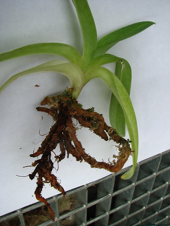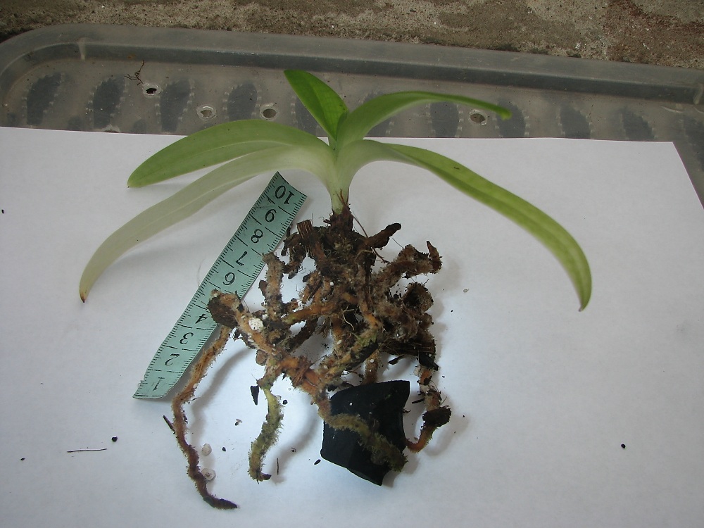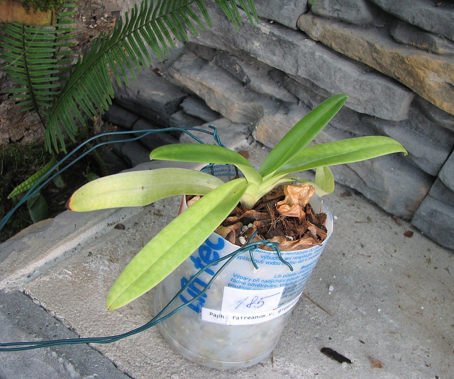 radzak píše: Dnes tu byla řeč o venustum a fairieanum. Přidal bych k nim třeba ještě adductum, randsii, wentworthianum, zieckianum...Když ti tyhle kytky bez problémů porostou, tak hluboce smeknu  . Když jsem tohle Paphiopedilum fairrieanum v. giganteum dostala bylo v jiném substrátu-(to je nakonec jasný každý má svůj podle svých podmínek) nahoře na substrátu bylo hodně rašeliníku.Na fotce (rychlofoto) je vidět spoustu malých kořenů který nepokračovaly v růstu.Myslela jsem si ,že je to příliš mokré pro mé podmínky.Rašeliník jsem tedy při přesazení nedala.Na tehdejším fotu je taky vidět že kořenů moc není –jeden hlavní a z toho jde něco málo kořenů.Tohle pafíčko roste v dubovém lese kde je i nějaký rašeliník, vápenatý šterk ,listí.Zatím jsem rašeliník do substrátu nedala. Povyrostlo –vlastně vidím stále nějaký malý růst .Světlo 20 000-30 000 Luxů to jsem poznala skoro hned.Klidně se růžice ohnula jak se táhla za světlem(nebylo to absencí zálivky)tak takto moje zkušenost - je to potvora rohatáááá v tom má Radzak pravdu.Pafíčko jsem dostala před zimou2011.Jde to ztuha.Je tu ještě nějaký majitel tohoto zázraku?