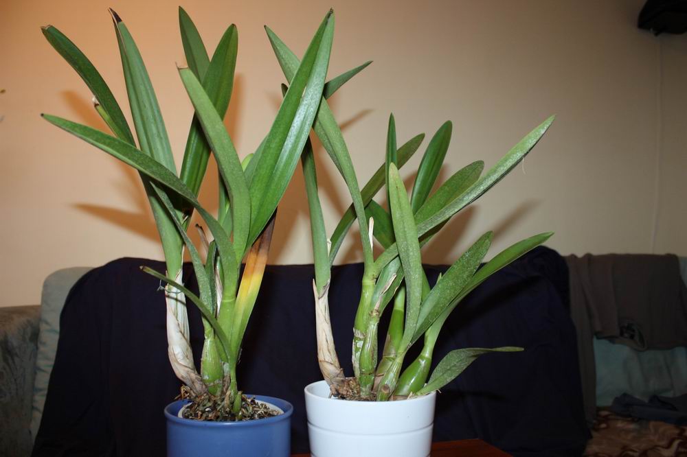 Ahoj, prosím Vás o názor. Kúpila som si 2 odkvitnuté rastliny , žial na štítku bolo čosi úplne od veci uvedené, a ani v kvetinárstve už presne nevedeli, aké boli a akou farbou kvitli. Jedna je úplne v pohode, len na povrch dosypať trošičku substrátu a odstrániť 1 list. Tá druhá sa im asi vykydla z kochlíka, treba ju nanovo zasadiť. Inak je ale pevná a netrpí žiadnou chorobou. No ja som usúdila, že jedna je nejaká Iwanagara (má na každej, aj vyzretej hluze 3 listy, je v modrom kochli) a tá druhá je habitusom velmi podobná (v bielom), ale má po 2 listy na každej hluze. Odhadujem ju na nejakú Catleju. Zaujímavé bolo, že obe majú kvetné púzdra na nových dozretých pahluzách, tak sa nechám prekvapiť, čo z toho bude. A zrejme sú to velmi kvetuschopné rastliny, lebo na ostatných starých hluzách boli kýpte po odkvitnutí. Ale aj tak ma zaujíma Váš názor, o aké rastliny sa jedná, lebo tieto majú docela pevné listy, tuhšie než moja pôvodná Iwanagara Apple Blossom. Je to docela vzrušujúce, ked ani neviem, či , ako, kedy a akou farbou vykvitnú  Ďakujem.