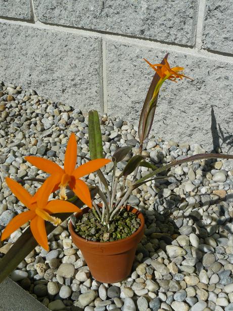Tak rozkvetla letošní první rupikola - Laelia harpophylla. Patří k monzunovým lélijím, které nejsou ve svých nárocích tak extrémní jako prérijní rupikoly z vyšších poloh. Pochází stejně jako všechny tyhle rostliny z Braziliie, kde roste v přímořských oblastech až do výšky 900 metrů.