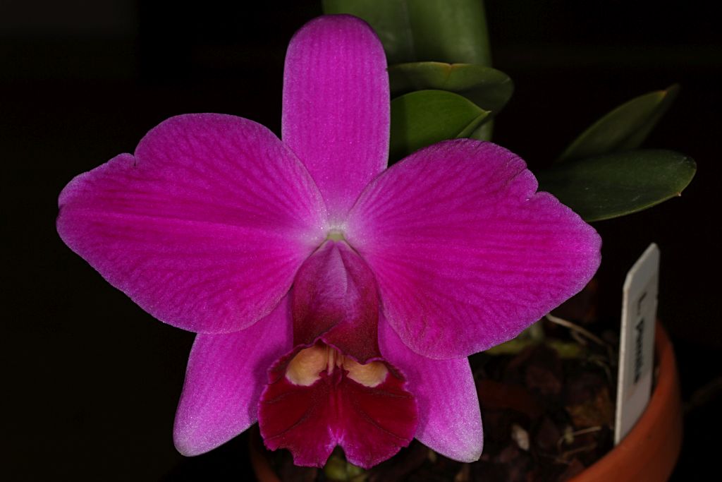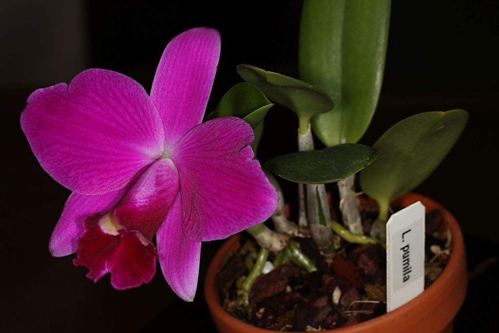 Jen tak náhodou jsem vylezl ve skleníku při zalévání trochu výš a mezi rostlinami se krčila L. pumila co jsem koupil na jaře v Dresdenu od BR Orchids. Jsem docela překvapen jak pěkná to je L. pumila. Je velice tmavá a měl jsem problém udělat slušný snímek. Celý den tma a tak jako vždy musím použít blesk. Není to ideál ale možná jsem to měl udělat v RAWU a trochu si s tím pohrát. Ale výsledek po zkomprimování stejně není moc dobrý. Je to první květ takže všechny následující květy budou jen lepší.