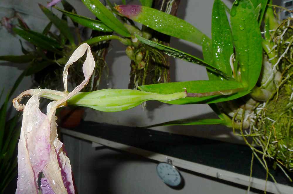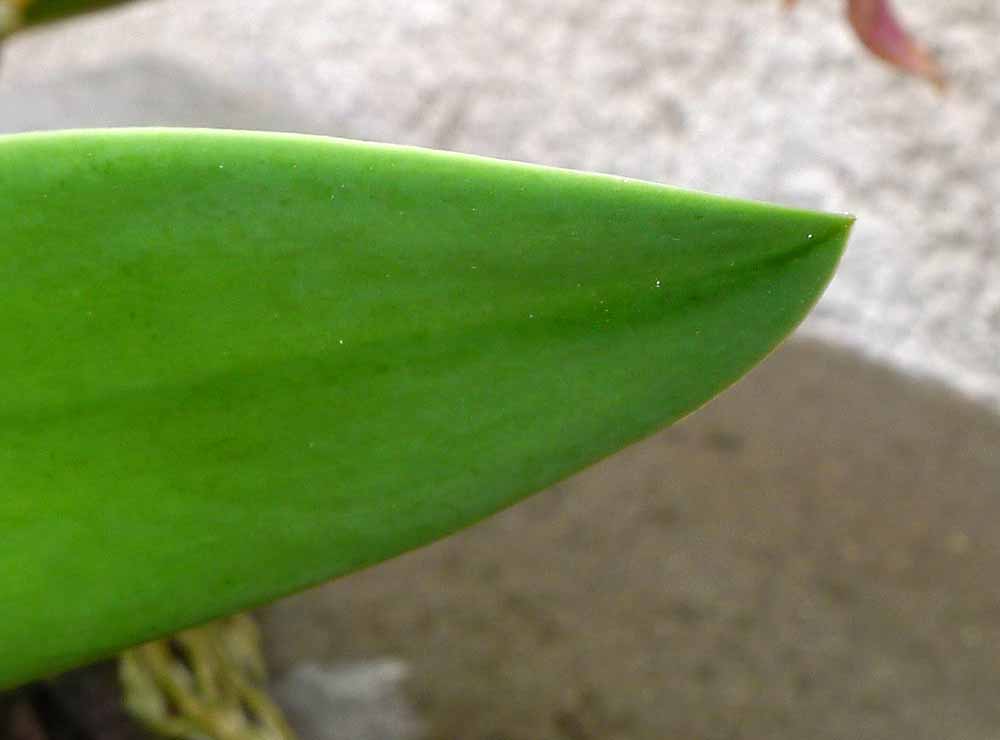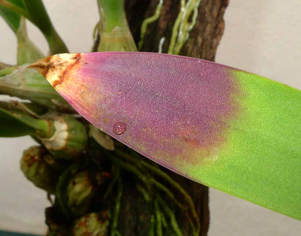 Loni se tu v nějakém vlákně řešily rudě zbarvené špičky listů u druhu Laelia speciosa. Uváděny byly různé možnosti od nedostatku nějakého prvku, přeslunění, poruchy ve vodním režimu ap. Nyní jsem dospěl k závěru, že to byla spíše fyziologická choroba z nevhodných podmínek. V ZZ začínaly špičky listů rašit ve vlhku a nedostatku světla, což způsobovalo jakousi neduživost nového pletiva. To pak rostlina bránila proti spálení od slunce zfialověním tak jak to tento druh dělá i v přírodě. Jak rostl list dále tak se světelná bilance zlepšovala a pletivo rostlo kvalitnější a proto dále listy nefialověly. Letos mi narostlo již asi 20 listů, ale ve skleníku v suchém vzduchu a na plném slunci a všechny špičky nových listů jsou perfektní, pevné a kulaté bez zbarvení.