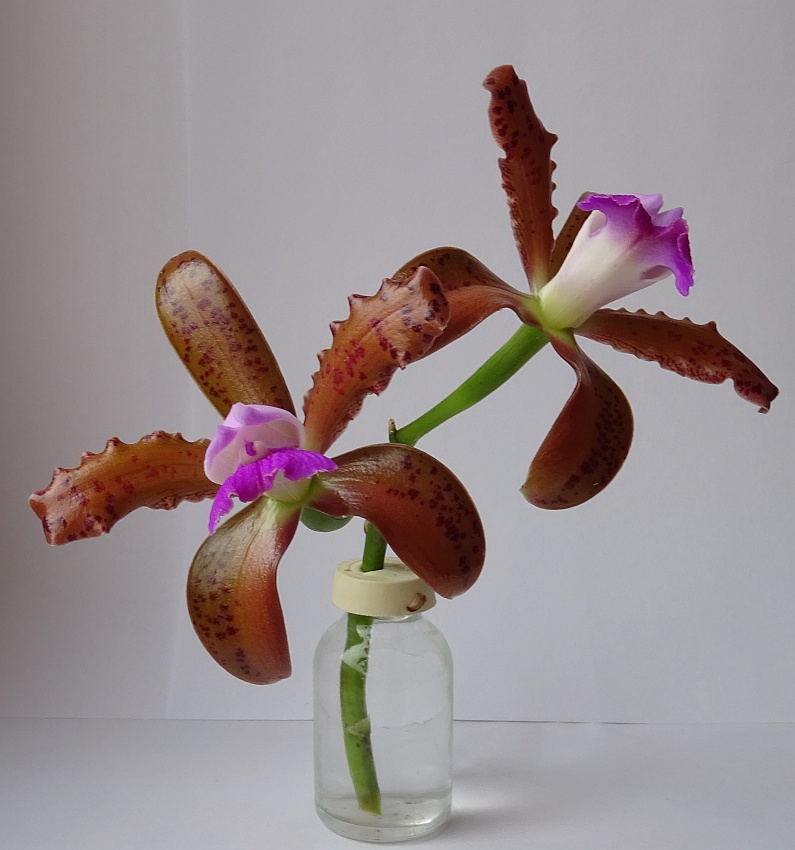 Pokouším se o křížení s jinými orchidejemi, také s C. schilleriana - foto. Kříženci C. schilleriana x Sch. tibicinis jsou už z flašek a v září k mání. Bude to podobné křížení s brysianou (Schombocattleya Matt Rinder, dvě fota z netu) Kříženci mají kromě exotických květů i dlouhé pevné stopky.
