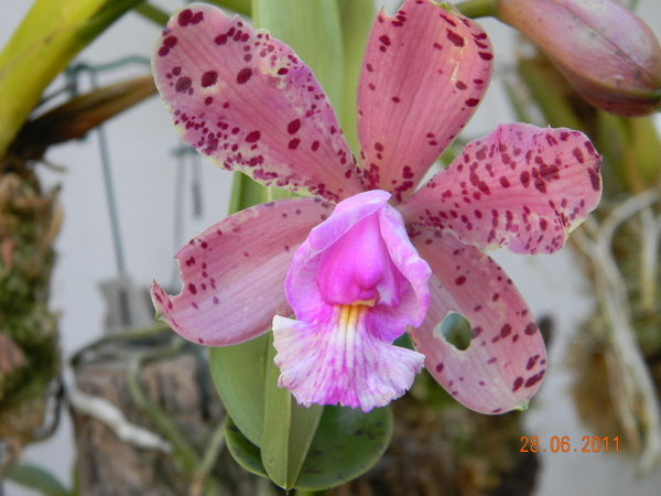 Rozkvetlo mi také toto křížení - Cattleya Brabantiae (C.aclandiae x C. loddigesii) Docela jsem trpěla, než se poupě otevřeno, protože jak vidno nějaká potvora se mi ho snažila sežrat.