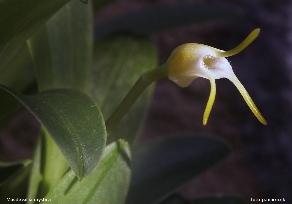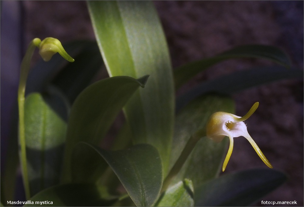 marťan píše: Masdevallia mystica. Roste interm.,u mne vykvetla až nahoře na skále při poměrně vysokých teplotách-cca 24 o C přes den,v noci 19-20. Drobná,květy cca 2 x 2 cm. Taky pěkná,já se těším až budu mít decumanu,jestli