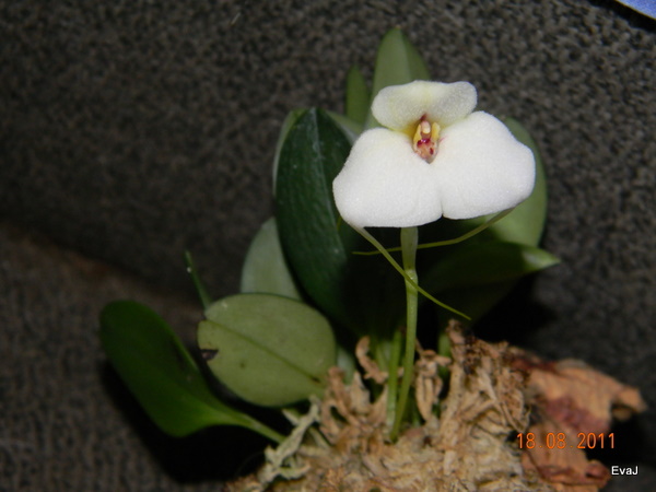 Tato masdevallia je menší vzrůstem, listy do 5 cm, květ na šířku také 5 cm. Mám ji vyvázanou na korku s rašeliníkem v teplotách 20-25 C (ve vitríně).