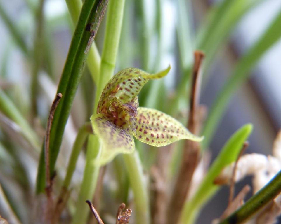 Rozkvetla Dryadella simula. Pěstuju ji krátce, ale vzhledem k tomu, že už mám delší dobu Dryadellu cristata, tak bych mohl říct, že dobře snášejí temperované podmínky se stálou vlhkostí a dobrým pohybem vzduchu. Zatím ji nemám ještě vyvázanou, ale určitě půjde na dobře zamechovaný kousek černého bezu. Momentálně je pouze volně s kořeny obalenými rašeliníkem. Možná se někomu nebude tento způsob pěstování líbit, Dryadelle je to stejně jedno.