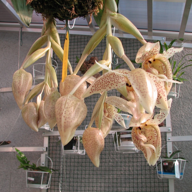 Občas si říkám kam to vše povede Fleky mám částečně po zimě jen na jedné rostlině a to je Stanhopea hernandezii a to mě mrzí. Až to pokvete (snad pokvetou zase)-to bude krása.Minulý rok se mě povedlo u jedné Stanhopeje být doma když právě nastal čas rozvíjení květů.Jinak to potvory vykonaly vždy, když jsem byla v práci .Šlo o Stanhopea costaricensis.Začlo to dopoledne. Do skleníku svítilo pěkně sluníčko -nikdo doma-bydlím v tíché části města -takže klídek. Stojím pod těma poupatama a čekám co kdyby. Pak to začalo .Bylo slyšet pvní lupnutí květní lístek vyletěl nahoru-lístek po lístku ,květ byl otevřen .Lup lup další a ta vůně.......Stanhopeje se rozvíjejí docela rychle. Je to blbost ale prostě paráda no .Pak vykvetla ještě jedna jiná Stanhopea a ty dvě rozdílné vůně se promísily v něco neposatelného trochu i šíleného