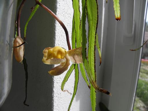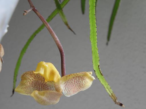 Gongora seideliana,tak tady je.Dnes mě mile překvapila.Měla původně 4 pupeny.Jak byla venku zavěšená tak mi o ni šmrncl druhy květináč a nalomil je.Takže už jsou jen dva,ten jeden se ještě nerozvil.Voní jako žvýkačka Pedro nebo ty dřívější barevné gumy,co byly tak dobré.... Nijak zvlášt o ni nepečuju,je na jižním okně zavěšená a udržuju stále mírně vlhkou.