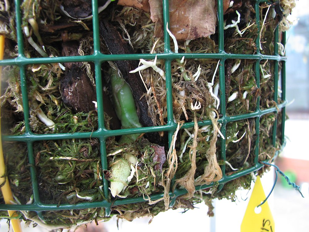 orchidejky píše: Učinil jsem obří objev, pokvete mi S. tigrina. Tak to se opravdu těš -krásný objev a přeju ti to .Protože až květní výhon vyleze uvidíš zázraky.Poupata jsou velký , květ taktéž a vůně taky. Jo k tomu květnímu výhonu-jasně v tomto případě jsi musel vyříznout .Ale já jsem do košíku po domluvě s pěstitelem (p.Mandlík)dala dost velké kousky kůry.Sama jsem si říkala hm....co když pokvete vyhne se ?A teď odpovídám i na názor Pavla Hegera na hrubost substrátu -vyhne.Snad je to na fotce vidět.Květní výhon roste dolů roste roste a pak -překážka asi ta kůra?Tak se ohne jinam  žádný problém.Netuším kolikrát by se takto uhnul.Ale síla přírody je někdy neskutečná .