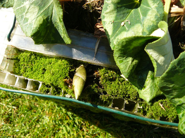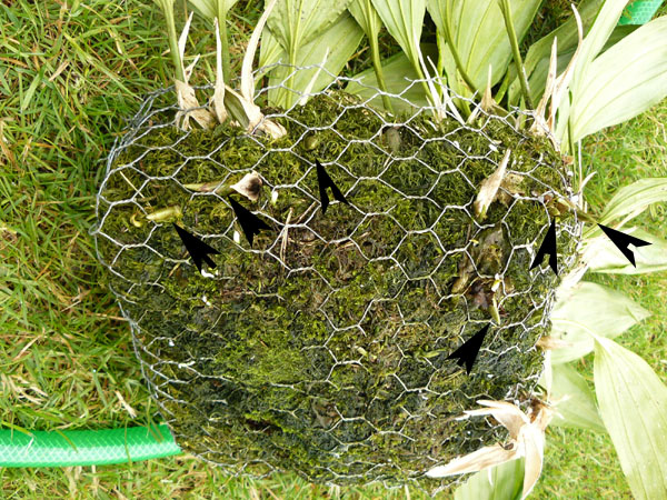 Tak přátelé, právě zalévám a prohlížím si rostliny co se změnilo během týdne. Čekalo mně veliké překvapení. Stanhopea tigrina var. rubra má nasazeno 8 květných stvolů viz šipky na vyfocených obou stranách košíku. Bohužel mi radost kazí to, že ji asi neuvidím kvést, protože 10.7.jdu na operaci a v nemocnici budu cca 2 týdny. Třeba si holka dá na čas a počká.