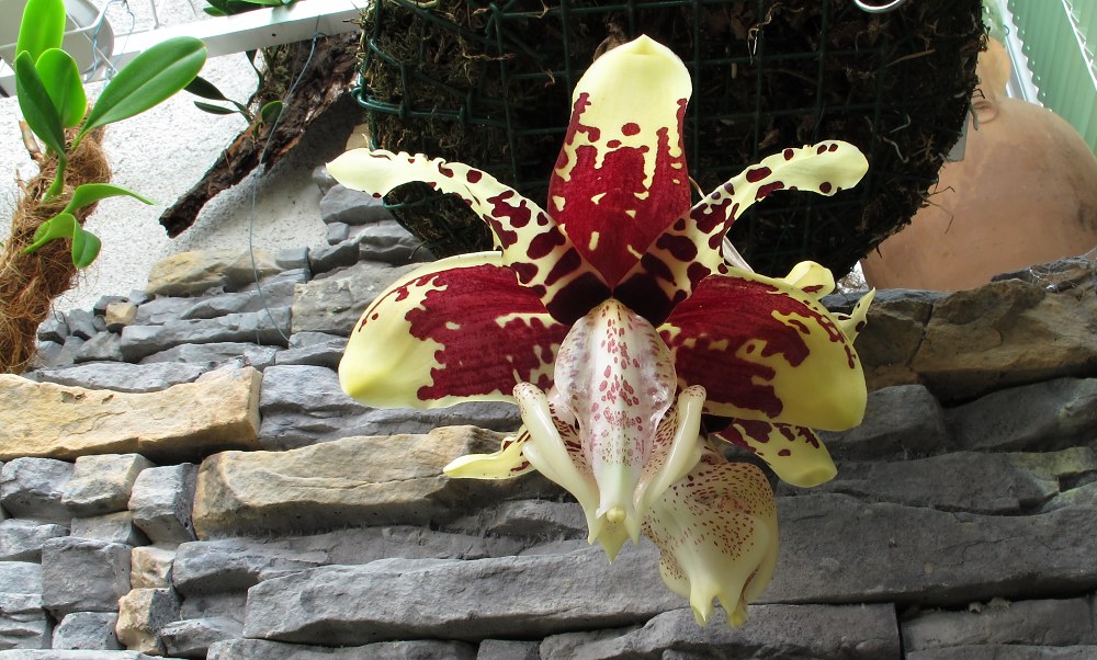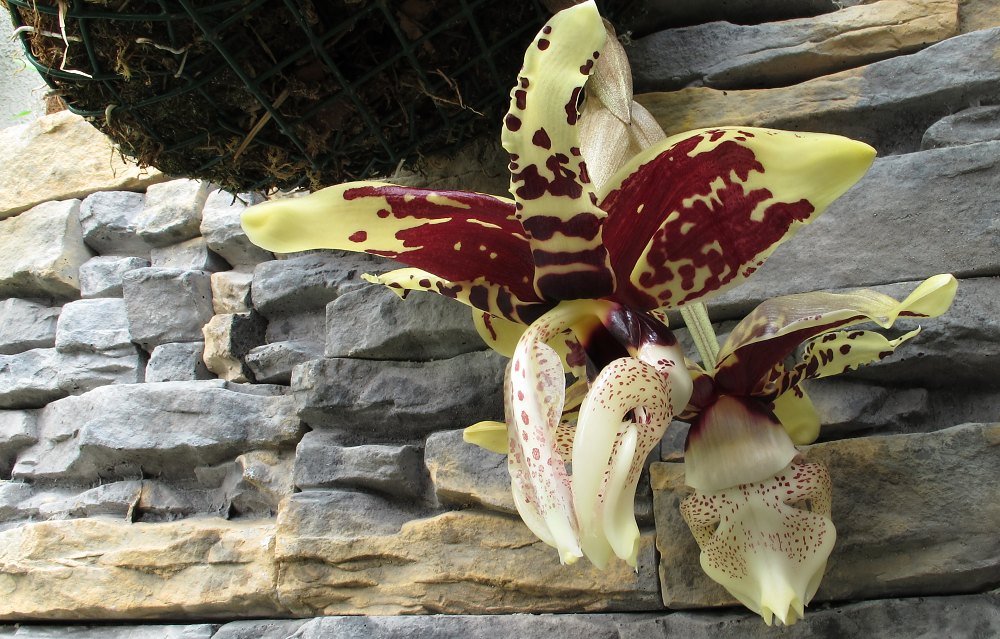 Stanhopea tigrina -jak vykvetla dnes ráno  Fotí se docela nerada .Vrtí se nechce se ukázat pořádně -tak byla přivázaná k focení ,ale jen trošku...
