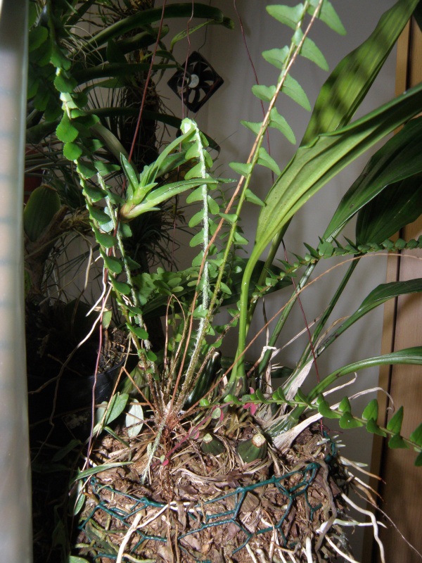 Ale zpět k Stanhopea shuttleworthii.....získal jsem od Aleše opravdu rozrostlou rostlinu, velmi letitou o počtu asi 8-9 pahlíz, která je usazena v poměrně hlubokém drátěném košíku, přesto si našlo květenství cestu ven bokem. Současně s touto orchidejí je zasazeno, či spíše spontálně vyrostlo i kapradí jménem Nephrolepis cordifolia (touto cestou musím poděkovat váženému panu řediteli Botanické zahrady v Liberci- p. RNDr. Studničkovi za její bližší určení), které tvoří svými dlouhými jemnými zpeřenými listy společně s orchidejí velmi svěží kombinaci zeleného zátiší.