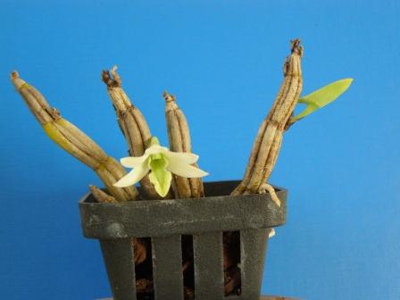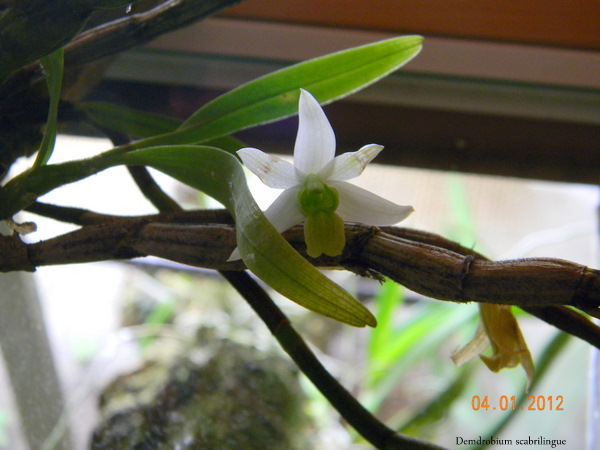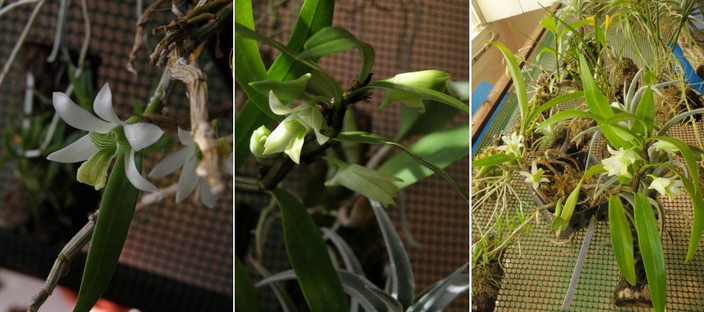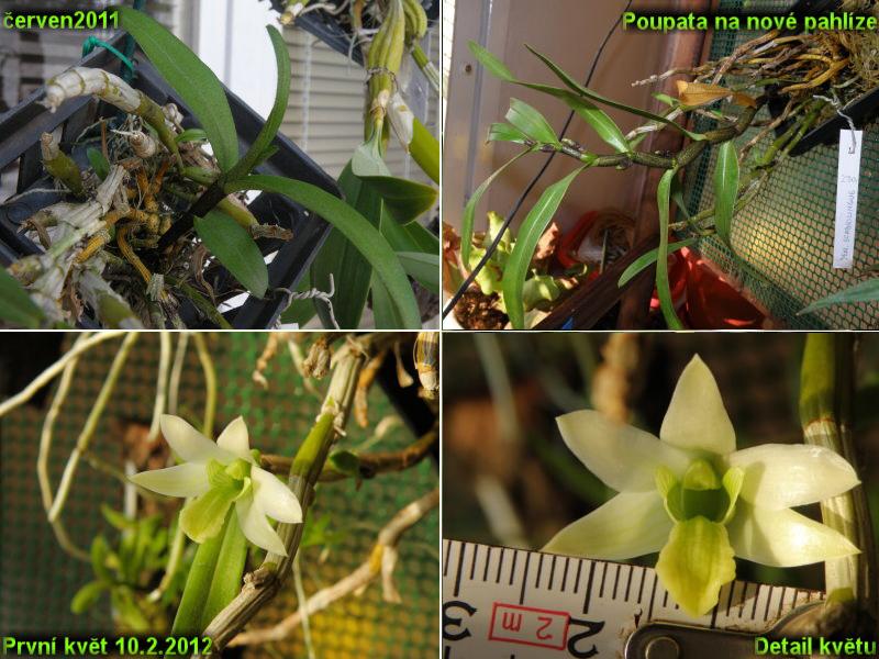 Když jsem si v červnu minulého roku pořídil tento druh, mající na fotografiích velmi efektní černé ochlupení a neméně zvláštní tvar a sladění barev květu, moc jsem ani nedoufal v jeho brzké vykvetení. Tušil jsem, že to velmi husté ochlupení, nebude mít tato zvláštní orchidej jen tak pro nic za nic, ale že hraje zřejmě důležitou roli v jímaní vzdušné vlhkosti a možná (to se jen domnívám) má i nějakou ochranou funkci proti požeru hmyzem. Ať už je pravda kdekoliv, rozhodnul jsem se této rostlině v době vegetace dát maximum vody a v zimě ji mlžit tak často, jak jen budu moci. Trochu jsem měl obavy z postřiku listů a následných hnilob při zimních nočních teplotách okolo 15-17st.C, a tak jsem jej umístil v místě s dostatkem vzdušného proudění. Nakonec se ukazuje, že není až tak náročná na trvalou vlhkost, jako např. Dendrobium violaceum, které nesmím zapomenout porosit ani na jeden den. Zjistil jsem, že přednostně při lehčím přisušení opadávají listy vždy od nejstarších pahlíz. Vykvetlo jak na loňské, tak i starší pahlíze. Souběžně s otevíráním poupat se místo jednoho květ.puku začala vytvářet i jedna keika, ale díky její spodní poloze a zbylému skapávání vody z horních míst, tato společně s posledním poupětem na pahlíze zahnila a přestala se vyvíjet. Na čerstvě otevřeném květu je barva pysku téměř bílozelená, postupně tmavne až je téměř sytě žlutá. Trochu jsem doufal, že barva se změní i na výslednou oranžovou, ale vidím že opravdu existuje více forem a tato je zřejmě rozšířenější, než ta oranžovopyská. Květ velmi decentně, hlavně po ránu, voní pro mne ničemu nepřirovnatelnou, ale svěží vůní.