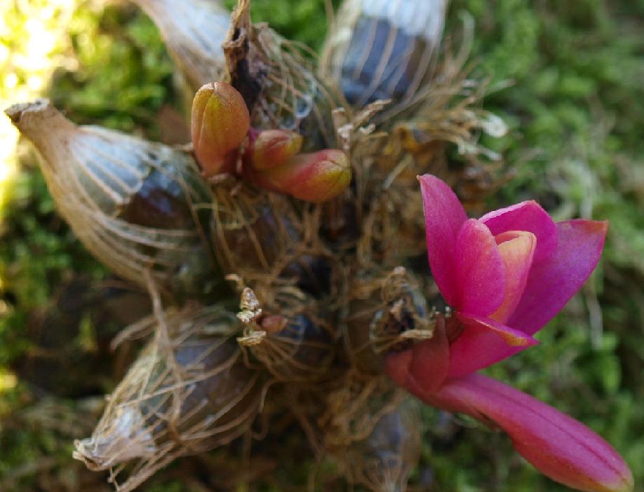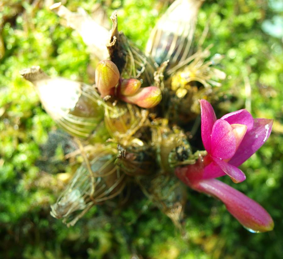aquaterra píše: Též jsem jedno růžové vloni v léte pořídil. Mám ho vyvázané a je v mechu. Přes zimu mělo teplotu cca 15 stupňů, cca v březnu shodilo listy. Teď se letní s každodenním, vydatným dopoledním mlžením. Velice hezky nasadilo na květ , jen mi nějak stále chybí listy. Vloni na podzim udělalo dvě nové pahlízy, ale letos zatím ani náznak. Tak už nakvítáme