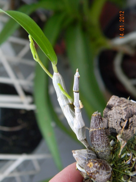 Je možný že by se začalo probouzet Dendrobium unicum? (Ten klacek vepředu s dvěma zelenýma pupíkama)
